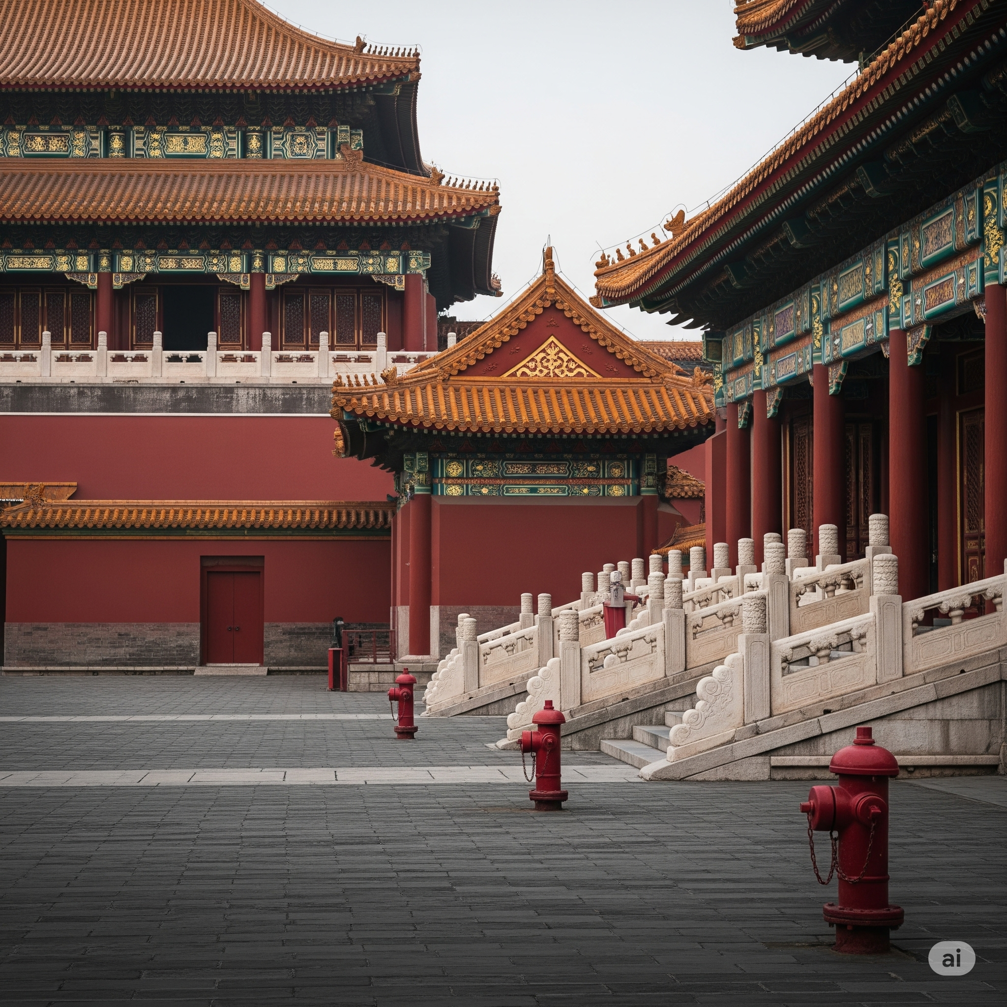 現代の建築学・都市気候学の観点から「木なし広場」を分析すると、防火上の意義が見えてくる。木は燃えやすい。広場に木があれば、隣接建物の火災が木を経由して延焼するリスクが生じる。太和殿広場のような広い石畳の空間は、火災の際に「延焼バリア」として機能する。実際、紫禁城内で繰り返された火災の記録を見ると、火が広場を超えて延焼した例は少ない——火は建物から建物へ直接飛び火するか、廊下・渡り廊下を伝って広がることが多かった。